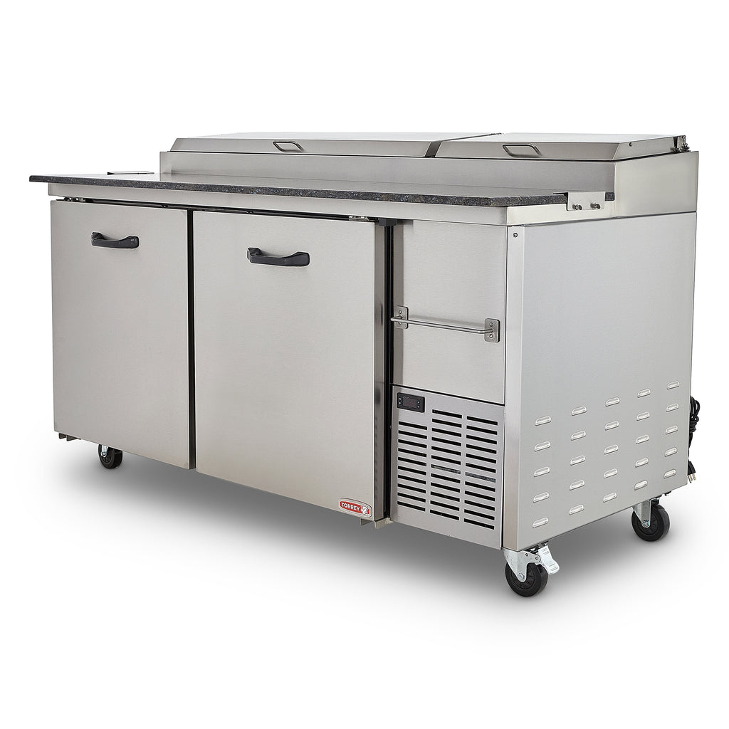 Mesa fria de preparacion hecha de granito. 9 insertos de policarbonato, siempre refrigerados, resistentes a impactos. Separadores de inserto en acero inoxidable. Control de Temperatura Digital (CTR). Parrilla posicional, mejor capacidad de almacenamiento. Ruedas de uso rudo, con su mecanismo giratorio se desplaza fácilmente. Enfriador por aire forzado, su rango de temperatura se regula de 0˚ a 5˚ C. Piso en acero inoxidable, fácil de limpiar, higiénico y resistente. Paredes inyectadas con poliuretano de alta densidad y acabado exterior en acero inoxidable. Refrigeración por aire forzado. Cubierta desmontable.