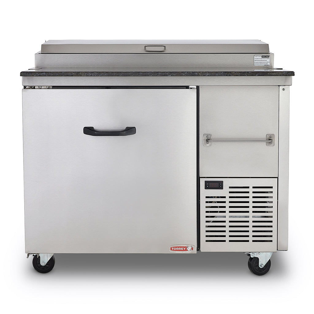 Mesa fría elaborada en acero inoxidable con placa de granito y 9 insertos de policarbonato de grado alimenticio y almacén y cajones refrigerados